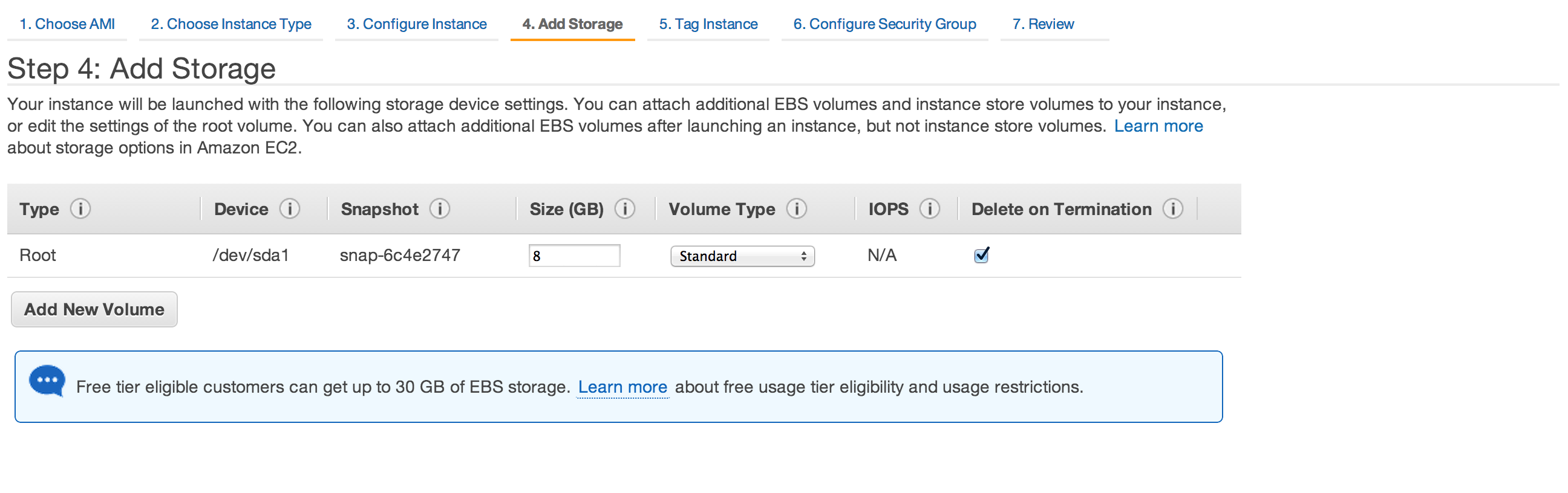 The same goes for step four “Add storage”. Usually you don’t need a lot of storage. For images, videos and other files I always use S3.