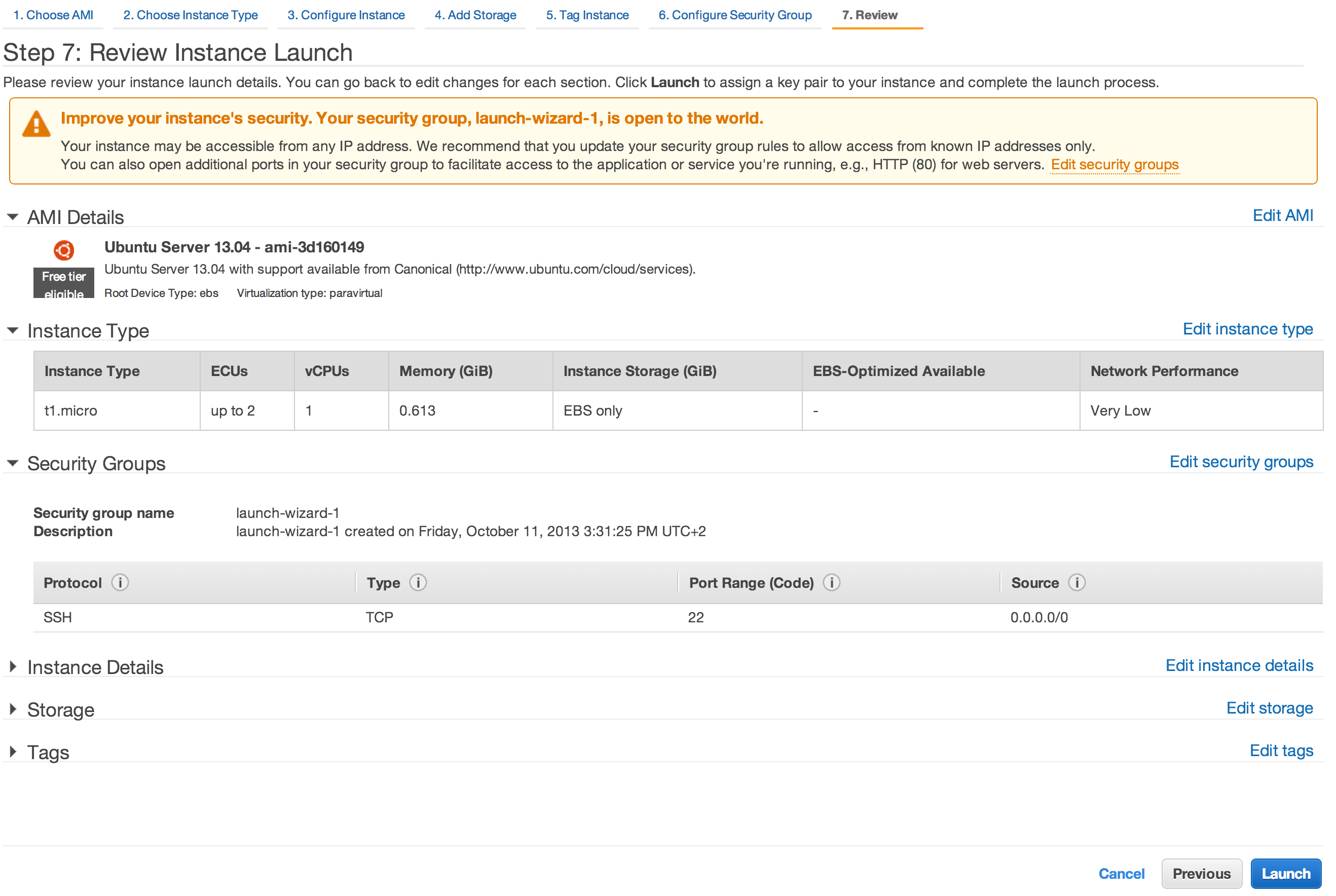 Last but not least check that everything is correct in step seven “Review”. Click on “Launch” to start your fresh instance.
