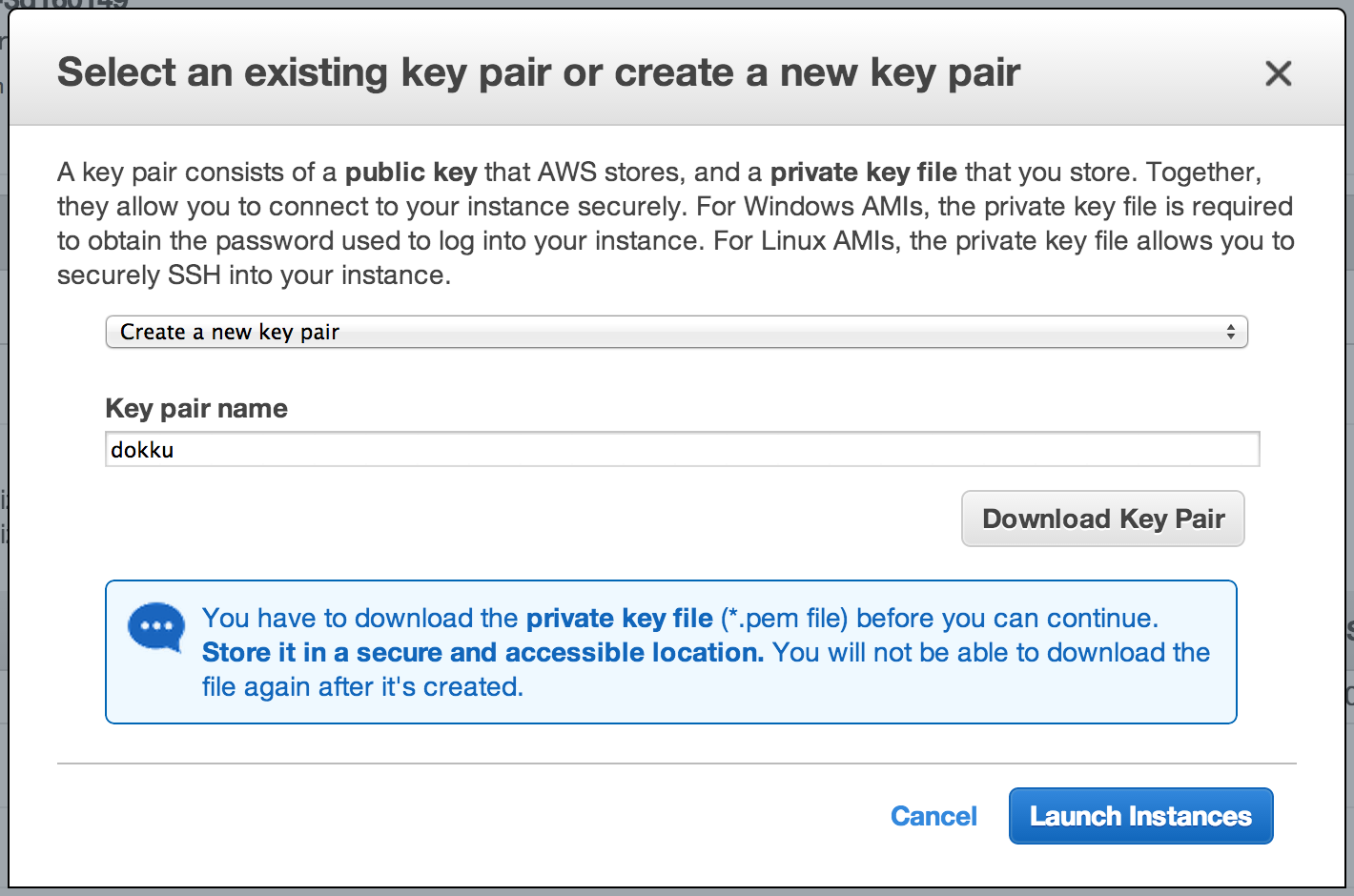 To connect to this instance via SSH you need to create a key pair (or use an existing one if you have). I named mine “dokku” and downloaded the “dokku.pem” file.