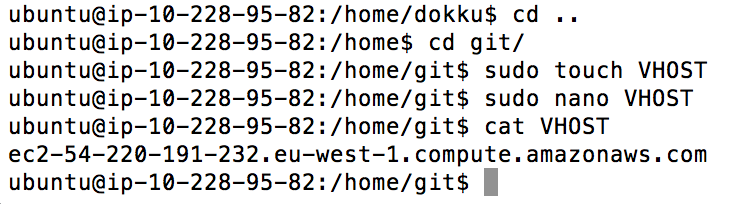 The last step to make Dokku work is to create a VHOST file in /home/git/. On your server change the directory to /home/git/