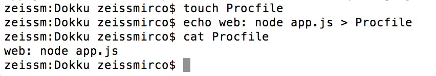 echo web: node app.js > Procfile to put the right command into the file and cat Procfile to verify that everything