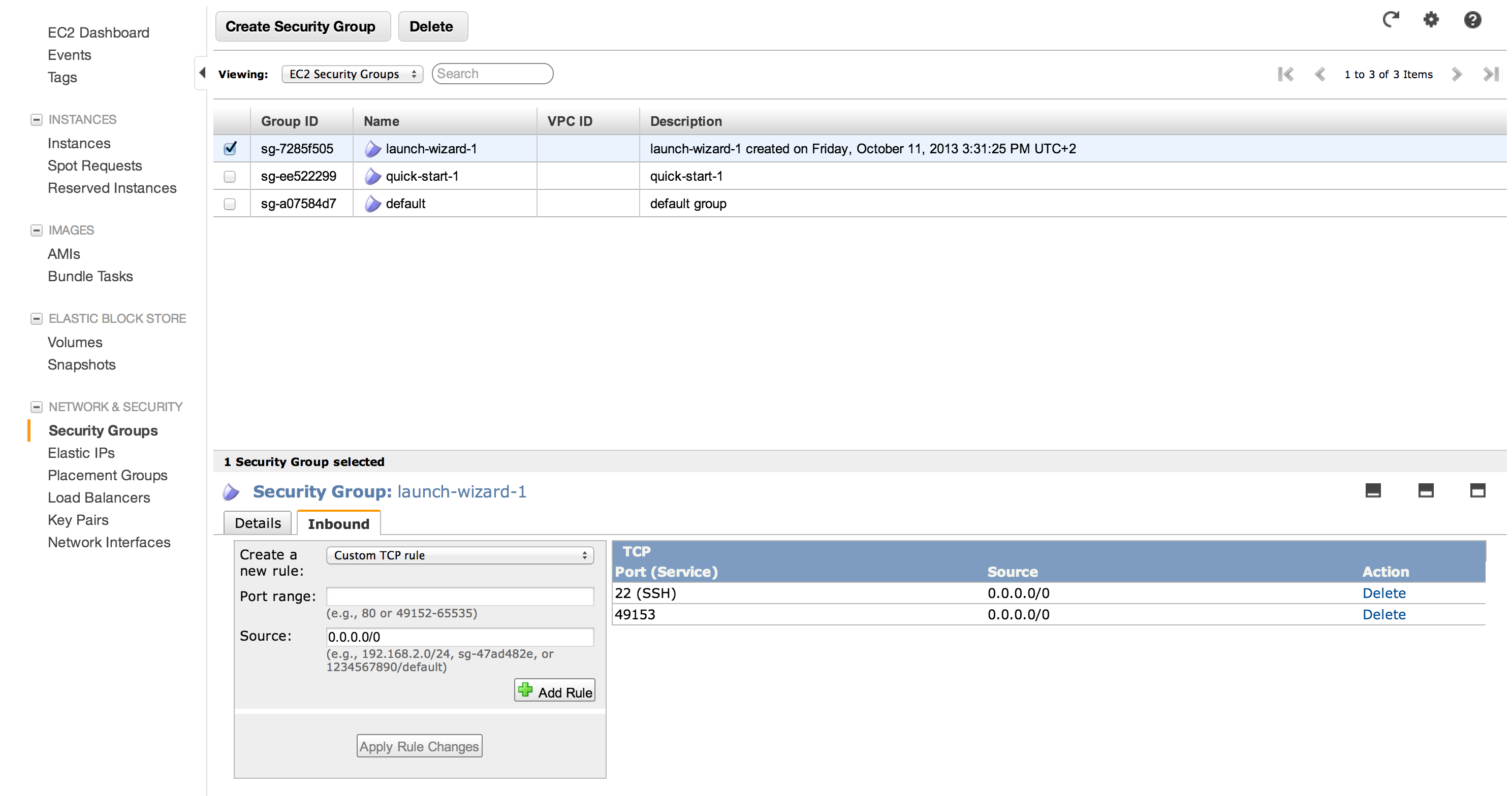 You might remember from the beginning where we talked about the security groups and how we will get back to this topic later on. Well that moment is now. In order to access the instance from the web you’ll have to open the port the app is running on. In the AWS console click on “Security Groups” on the left side and select the one we used for our instance. In my case it was “launch-wizard-1”. At the bottom click on “Inbound” and enter your port in “Port range”. For me it was port 49153. Click on “Add Rule” and “Apply Rule Changes” to save the settings.